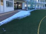 本日は降雪による路面凍結やバスの運休に伴い、臨時休業となりました。 朝には一面の銀世界だった運動場も、時間の経過とともに雪がかなり解けてまいりました。