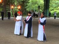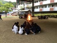1日目の夕食、キャンプファイヤーの様子です。キャンプファイヤー第一部では、火の神、火の子たちの衣装や動き、セリフで厳かな雰囲気をつくりました。第二部のレクリエーションでは、学年全体で盛り上げていました。